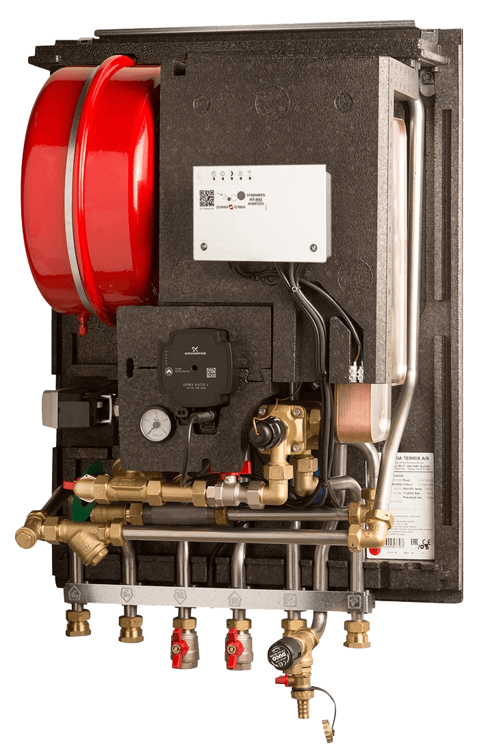 Termix VVX med den intelligente TPV-regulator og fuldisolering er en komplet fjernvarmeunit til indirekte forsyning med indbygget vandvarmer og varmeveksler til rumopvarmning. Den komplette fuldisolering sikrer minimalt varmetab under tapning og i tomgangsfunktion. Leveres med en T16H+ pladeveksler, der skaber optimal afkøling på primærsiden, samt vejrkompensering. Passer direkte sammen med Termix Fordelerunit. Overholder kravene i DS452 til isolering og DS469 til vejrkompensering.